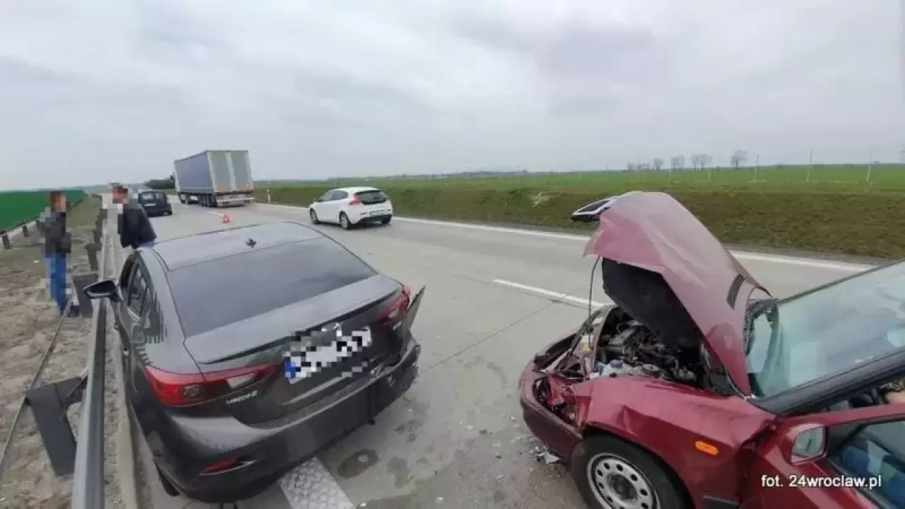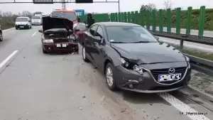 Na 127 km autostrady A4 w kierunku Wrocławia doszło do zderzenia trzech pojazdów. Prawdopodobnie wskutek niezachowania odpowiedniej odległości przed poprzedzającym pojazdem, kierujący samochodem marki Skoda uderzył w tył samochodu marki Mazda, który popchnięty siłą uderzenia najechał na tył pojazdu marki Dacia.