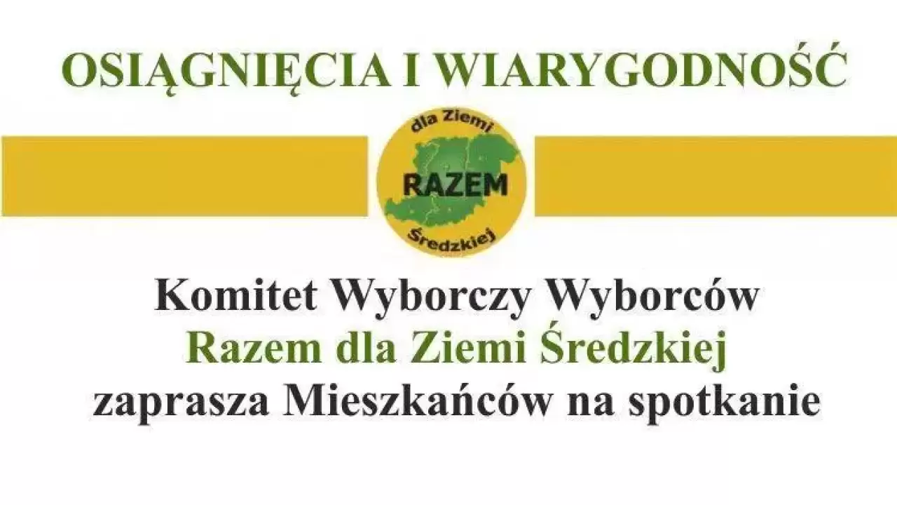 Komitet Wyborczy Wyborców Razem dla Ziemi Średzkiej zaprasza Mieszkańców na spotkanie z kandydatami na: Burmistrza Jerzym Krycińskim, do Rady Miejskiej Zdzisławem Kruszelnickim, do Rady Powiatu Adamem Rucińskim i Przemysławem Urbaniakiem.