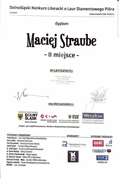 W gminie Środa Śląska młodych talentów nie brakuje! Maciej Straube, uczeń Szkoły Podstawowej nr 3 w Środzie Śląskiej zdobył 2. miejsce w Dolnośląskim Konkursie Literackim o Laur Diamentowego Pióra. Serdecznie gratulujemy!