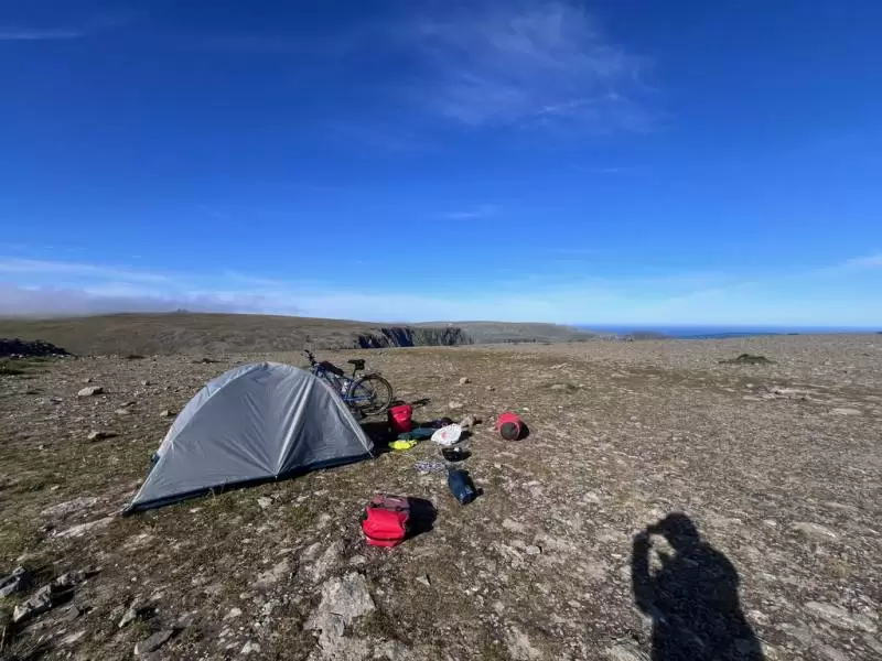Po niespełna dwóch tygodniach, w środę 10 lipca, gdy licznik rowerowy przekroczył 1700 km, dotarłem do celu i rozbiłem namiot tuż obok charakterystycznego dla tego miejsca pomnika w kształcie globu. Silny wieczorny wiatr ustał dopiero koło północy. A ponieważ panuje tam polarny dzień i słońce nie zachodzi, wyszedłem na sesję zdjęciową. Zmęczony, ale szczęśliwy, że udało mi się spełnić kolejne marzenie.