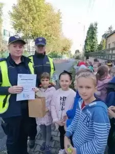 Po przypomnieniu podstawowych zasad oraz omówieniu znaczenia znaków drogowych, które znajdują się w pobliżu przejść, dzieci ćwiczyły bezpieczne przechodzenie na drugą stronę ulicy. Po prawidłowym wykonaniu tego zadania w nagrodę wszyscy pierwszoklasiści otrzymali znaczki odblaskowe.