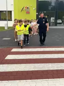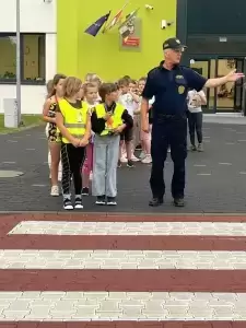 Uczestnicy mieli okazję nauczyć się, jak bezpiecznie przekraczać przejścia dla pieszych, unikać niebezpiecznych miejsc, takich jak zakręty czy wyjazdy z parkingów, oraz jak właściwie zachowywać się w sytuacjach zagrożenia. Dzięki aktywnemu uczestnictwu dzieci zyskały cenną wiedzę praktyczną i pewność siebie w poruszaniu się po drogach. Dodatkowo, pracownicy Straży Miejskiej pokazali dzieciom, jak działa sygnalizacja świetlna oraz jak rozpoznawać różne znaki drogowe. Wszyscy uczniowie z dużym zaangażowaniem brali udział w zadaniach a najmłodsi uczniowie otrzymali odblaskowy element, aby mogli być lepiej widoczni na drodze.