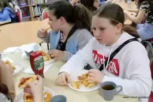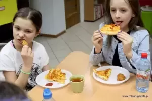 Wieczorem nie zabrakło kolacji, na stoły podano pizzę oraz polędwiczki z kurczaka. Następnie młode kobiety, wzięły się za wyszywanie koszulek. Ozdobne materiały, koronki, frędzle oraz naszywki spowodowały, że każdy t-shirt był jedyny i wyjątkowy w swoim rodzaju. Dziewczęta wykonały też własnoręcznie bransoletki z muliny