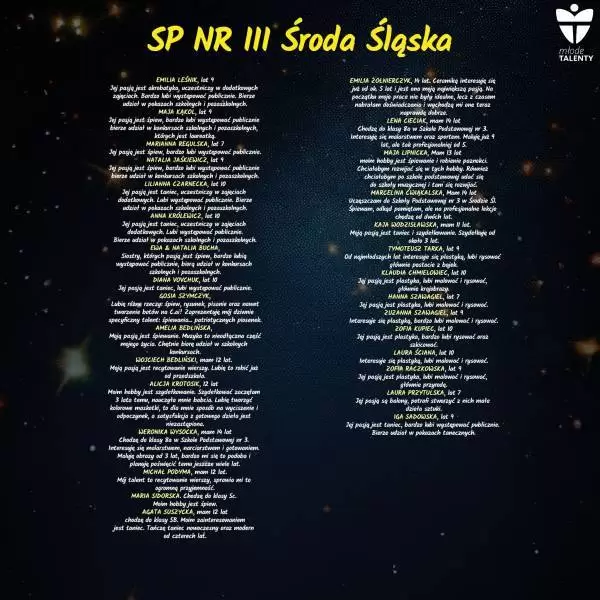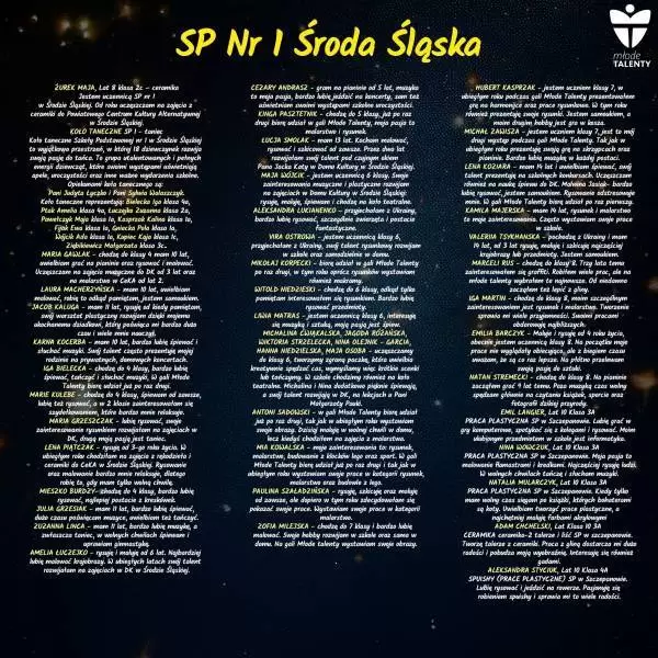 Podczas wydarzenia swoje talenty zaprezentują uczniowie 7 średzkich szkół, a jeśli jesteście ciekawi szczegółów, zapraszamy do galerii poniżej, gdzie znajdują się informacje o uczestnikach.