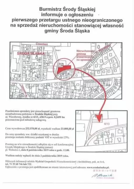 Szanowni Państwo! Niniejszym zapraszam do zapoznania się z ofertą inwestycyjną Gminy Środa Śląska i skorzystania z możliwości zakupu po bardzo atrakcyjnej cenie działki nr 6/13 AM-9 obręb 6 o powierzchni 0,2459 ha, położonej przy ul. Wierzbowej w Środzie Śląskiej, przeznaczonej w obowiązującym miejscowym planie zagospodarowania przestrzennego pod zabudowę usługową.