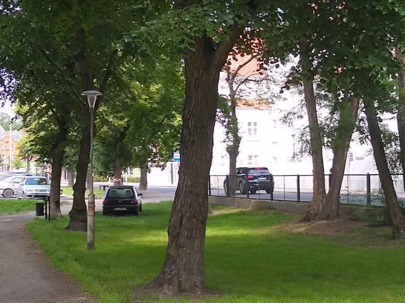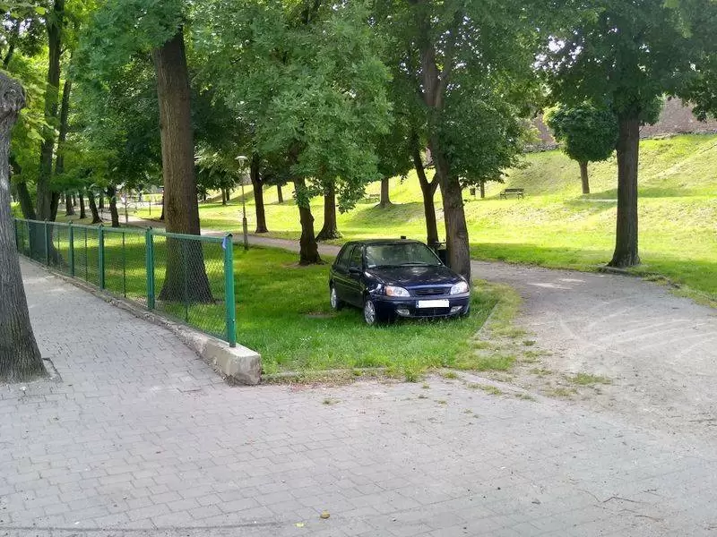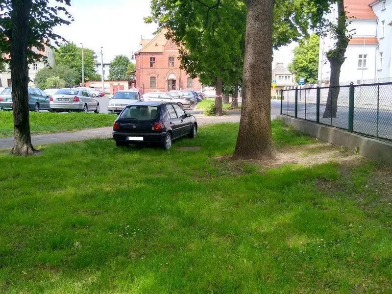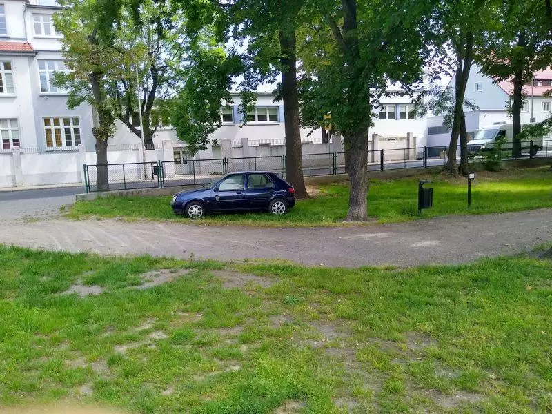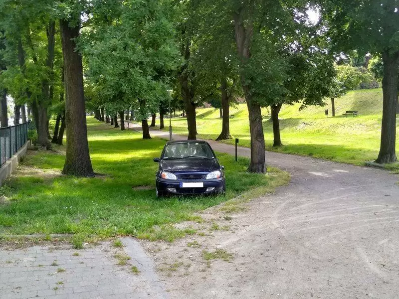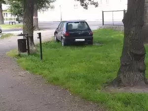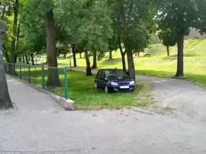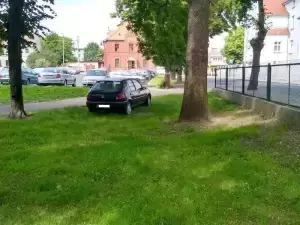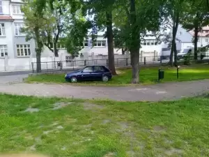 Zaparkowany na terenie parku miejskiego w Środzie Śląskiej samochód wzbudza ogólne zainteresowanie, co nie dziwi z uwagi na nietypowe miejsce pozostawienia pojazdu.