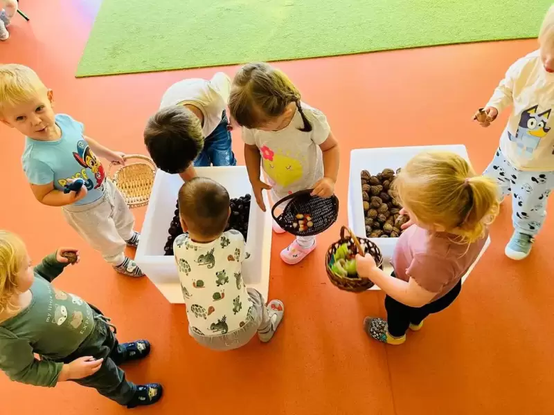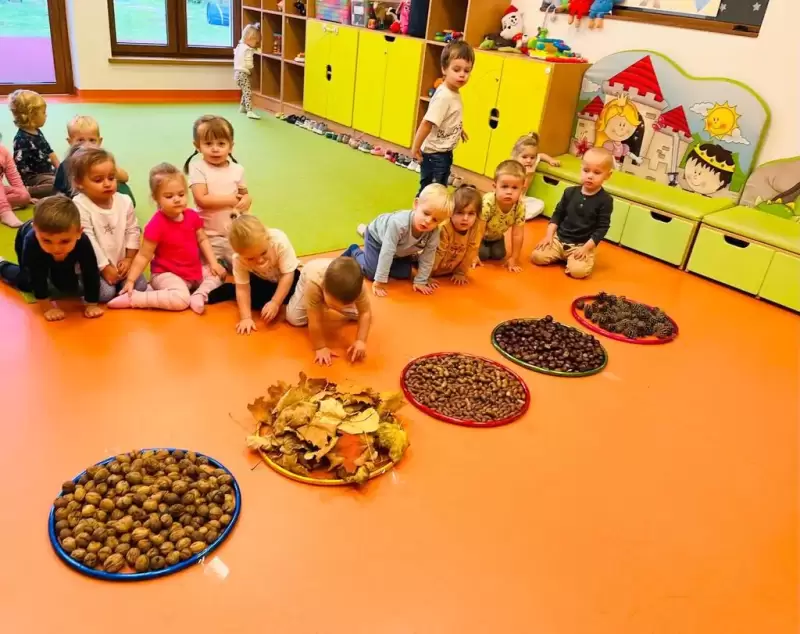 Przy użyciu kasztanów, orzechów, żołędzi, liści oraz szyszek, dzieci miały przygotowaną ścieżkę sensoryczną. Dużo radości sprawiła im również zabawa w odnajdywanie grzybków i zwierzątek ukrytych wśród orzechów i kasztanów znajdujących się w podświetlanych stolikach.