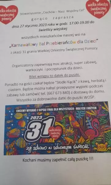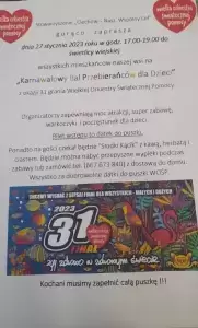 Wszystkie datki zebrane do puszek w trakcie w/w wydarzeń zostaną przeznaczone na 31. Finał Wielkiej Orkiestry Świątecznej Pomocy. Dziękujemy za chęć wsparcia akcji WOŚP i współpracę ze sztabem #1835 Dom Kultury w Środzie Śląskiej. Razem możemy więcej!