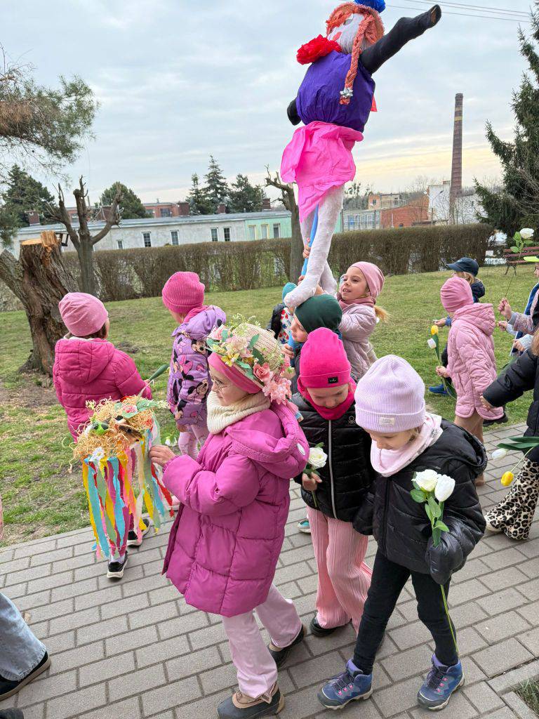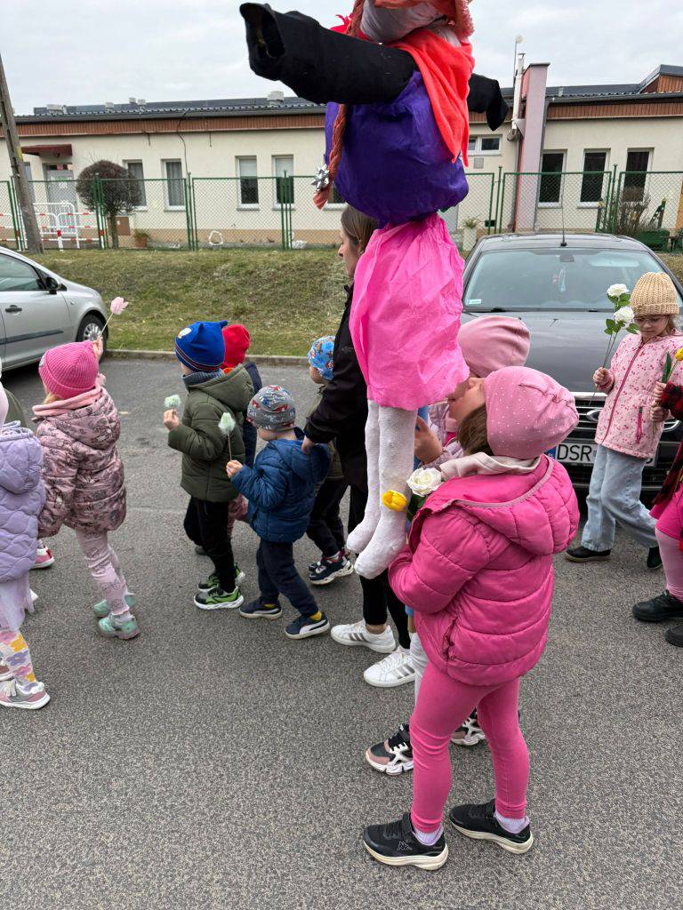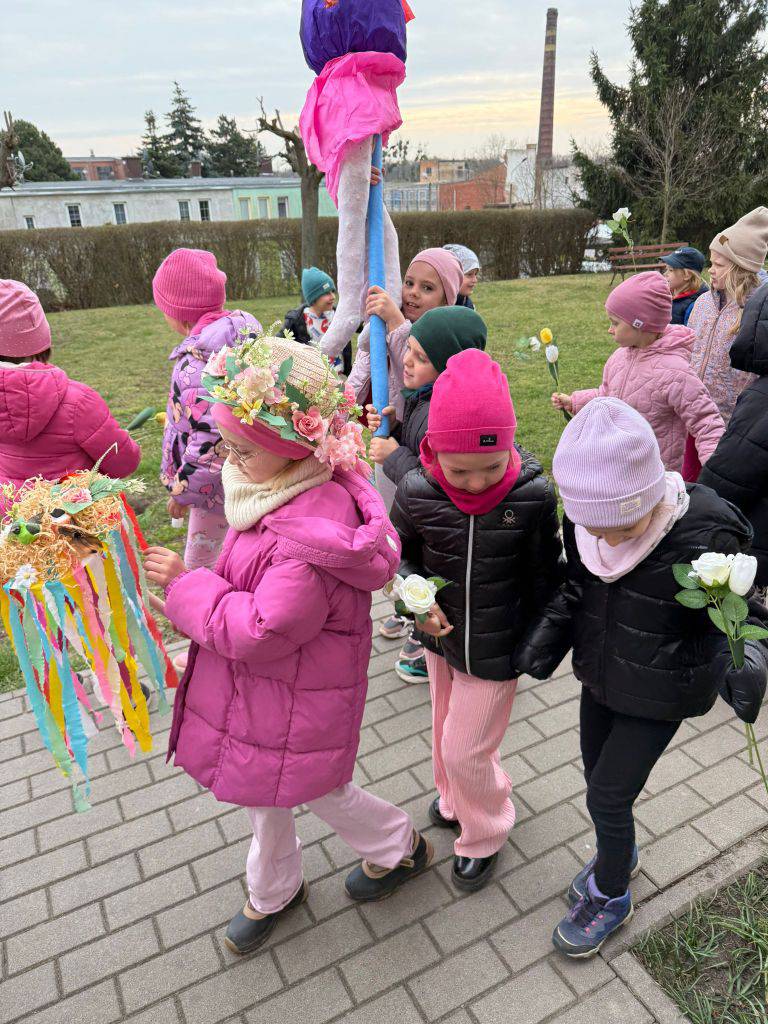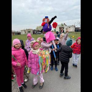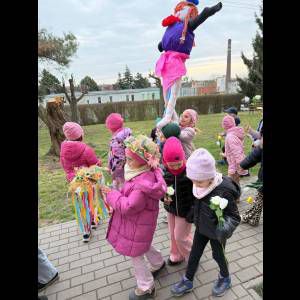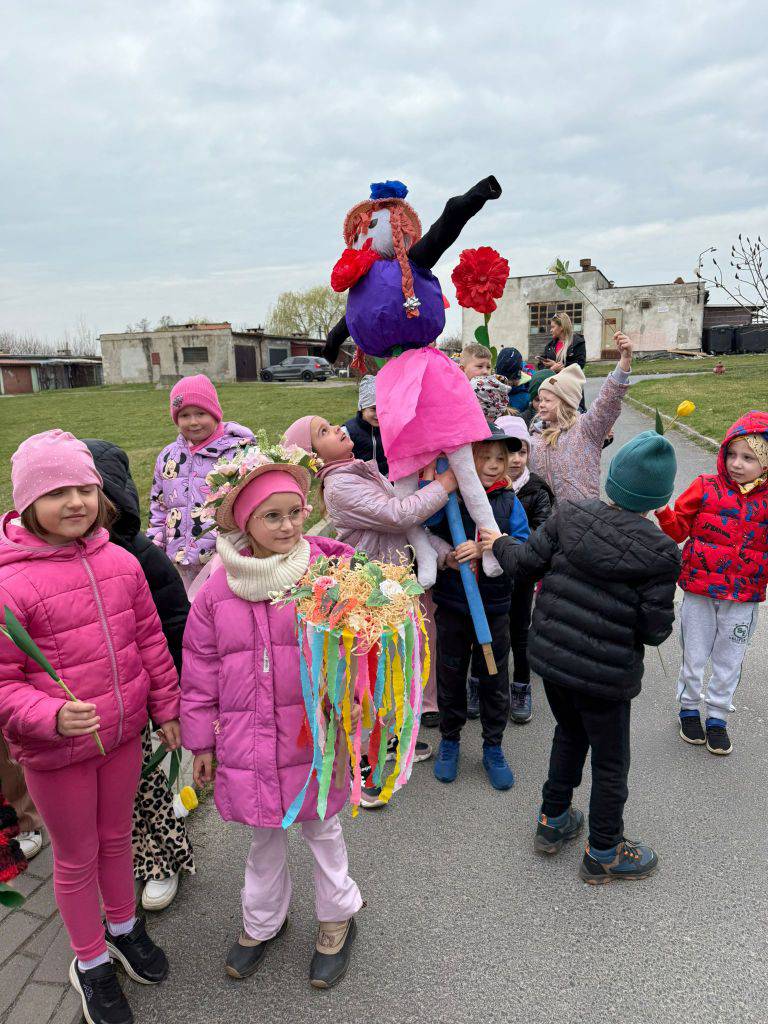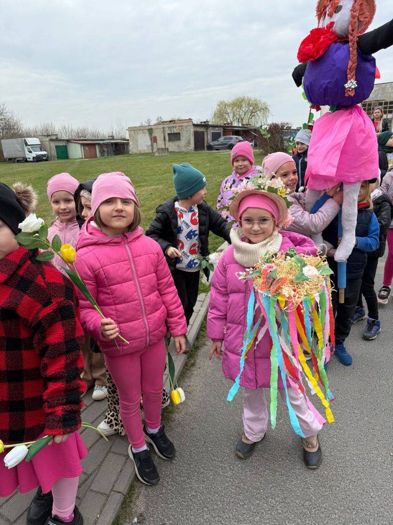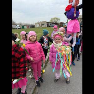 Tradycyjnie wszystkie dzieci, wzięły udział w obrzędzie pożegnania zimy i powitania wiosny. Ubrana w kolorową sukienkę ozdobioną kwiatami – Marzanna wraz z dziećmi wyruszyła na wiosenny spacer. Dzieci z radością maszerowały w wiosennym pochodzie, z okrzykami witającymi Wiosnę!