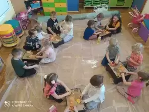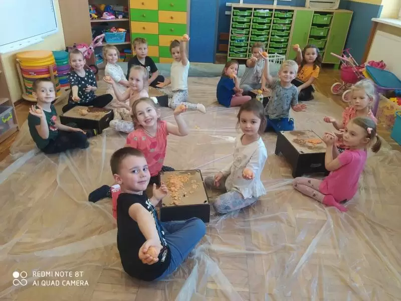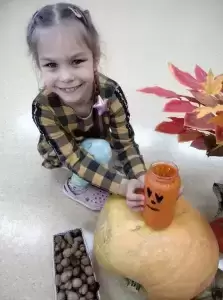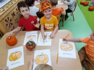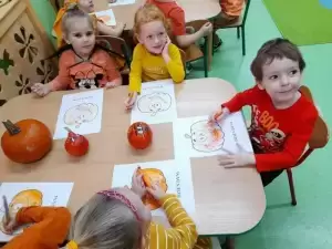 Następnie przystąpiliśmy do dyniowych zabaw: klasyfikowania dyń wg wielkości, koloru i kształtu, szeregowania od największej dyni do najmniejszej, przeliczania dyń, odczytywania dyniowych sylab, gry w domino i wiele innych. Wśród zabaw ruchowych były skoki przez różnej wielkości dynie, slalom dyniowy oraz zabawy taneczne. Dzieci z zapałem zabrały się również do prac plastycznych, które z radością zabrały do swoich domków.