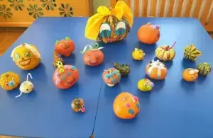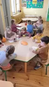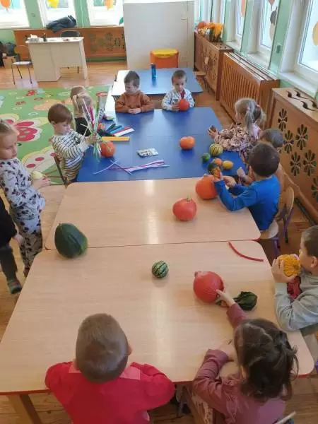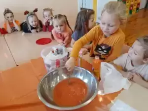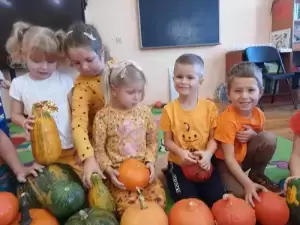 W każdej grupie odbyły się dyniowe zabawy: klasyfikowanie dyń według wielkości, koloru i kształtu, szeregowanie od największej dyni do najmniejszej, przeliczanie dyń i wiele innych ciekawych i pouczających zabaw. Powstała nawet naturalna ciastolina, w kolorze dyni oczywiście.