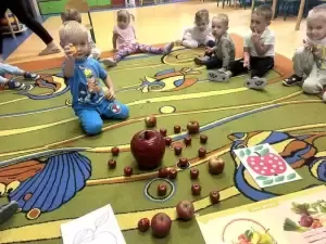 Dzieci miały okazję poznać budowę jabłka – dowiedziały się, co kryje się pod skórką, jak wyglądają pestki i dlaczego warto jeść ten owoc w całości. Przedszkolaki z zainteresowaniem słuchały opowieści o wartościach odżywczych jabłka, które dostarcza witamin i energii potrzebnej do codziennej zabawy i nauki.