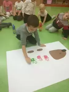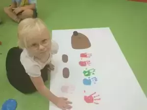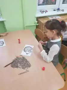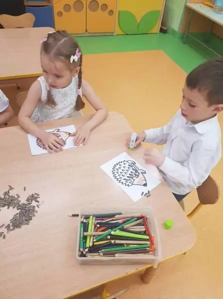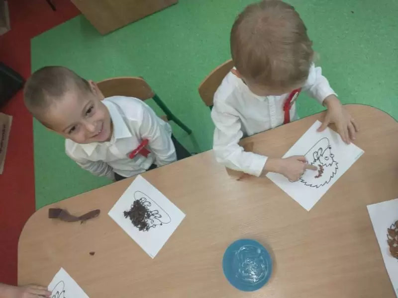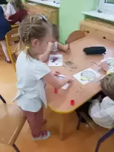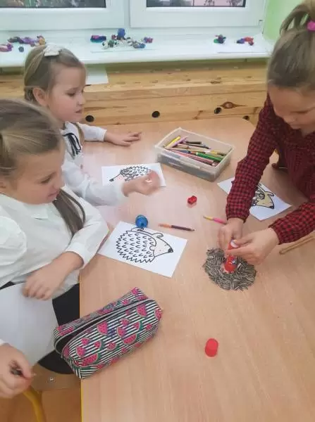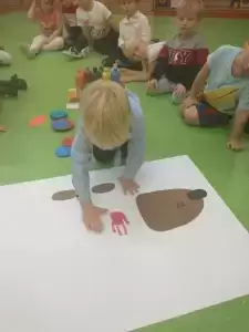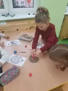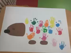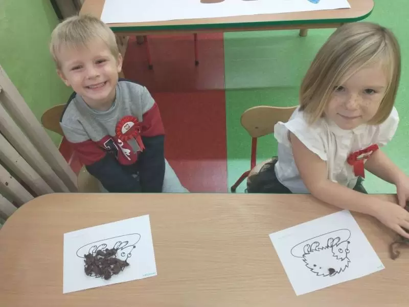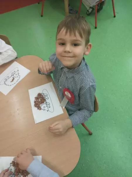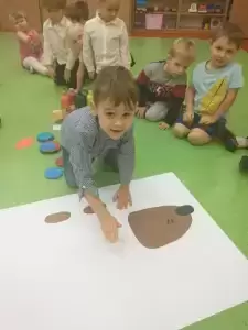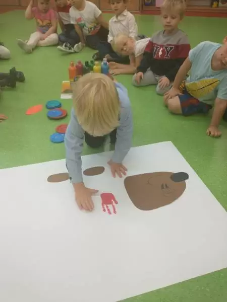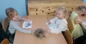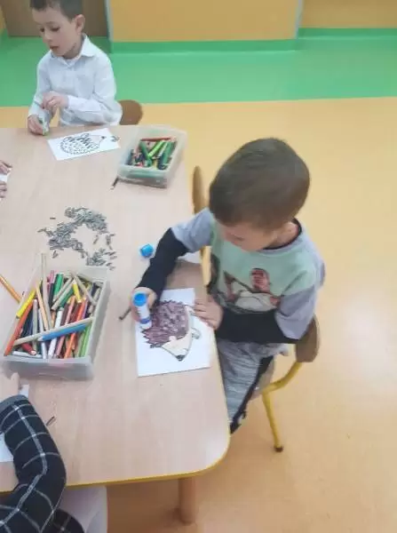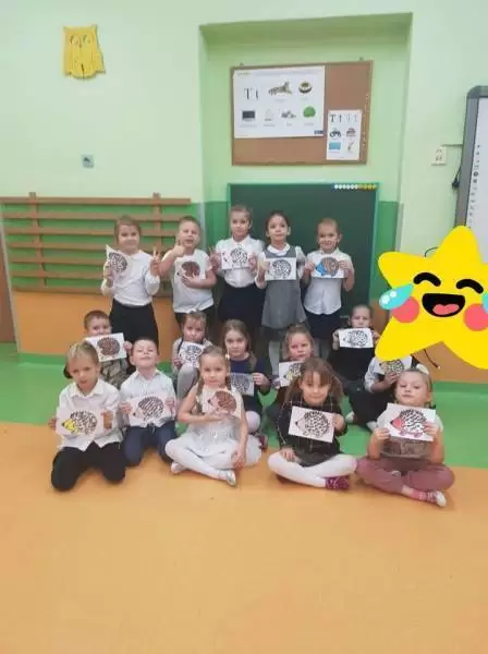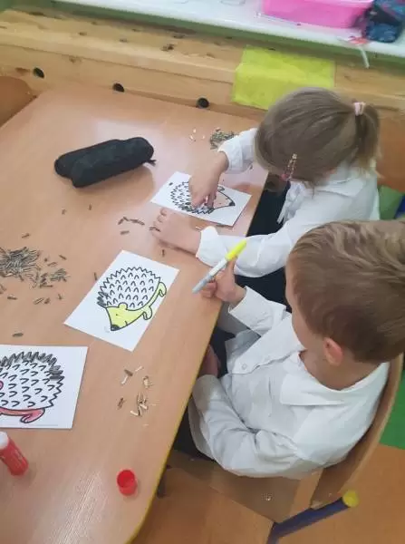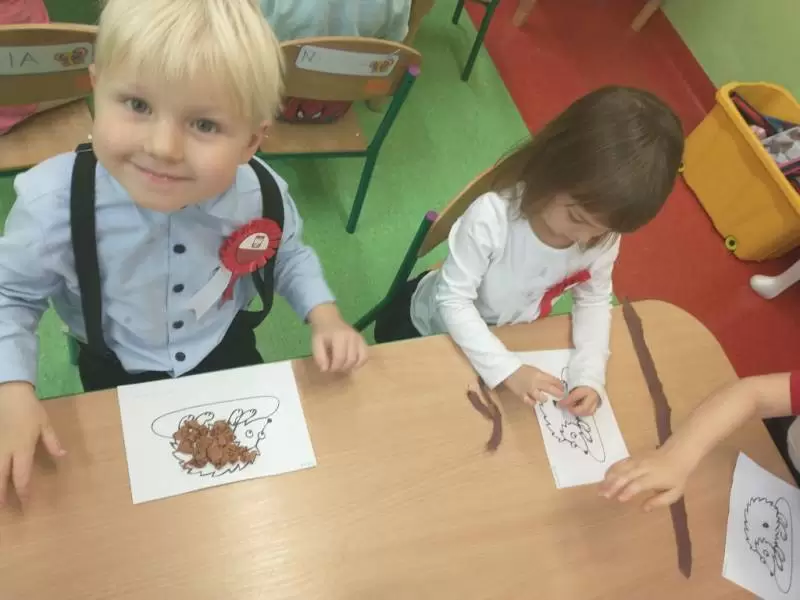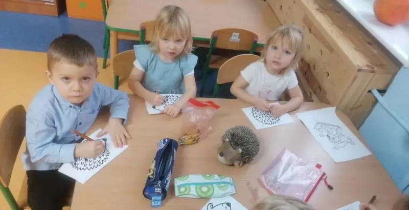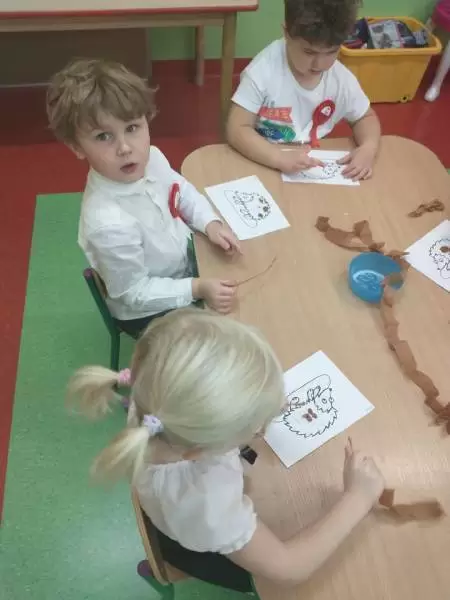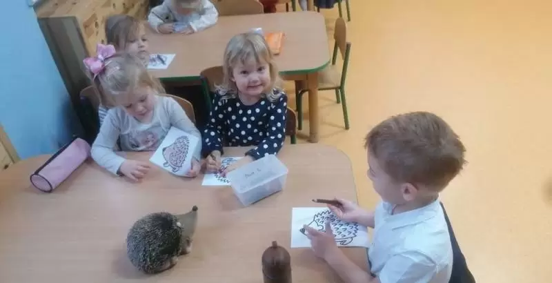 Dzieci dowiedziały się również na jak długo jeże zapadają w sen zimowy. Ponadto nie mogło zabraknąć tradycyjnej zabawy „Na dywanie siedzi jeż” oraz leśnych zagadek. Przedszkolaki bawiły się i tańczyły przy muzyce i piosenkach o jeżach. Z pomocą pań dzieci wykonały jeżyki różnymi technikami plastycznymi. Przedszkolaki mogły wykazać się inwencją twórczą i ozdobić prace wg. własnego pomysłu.