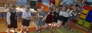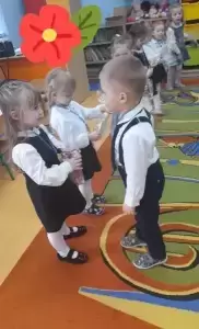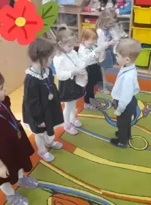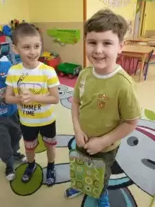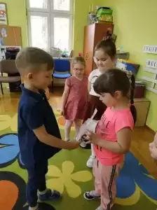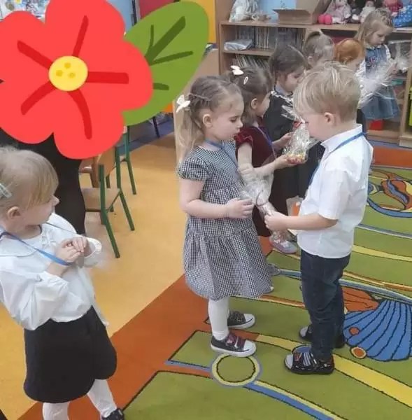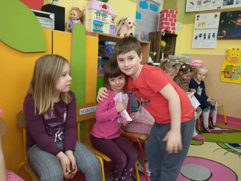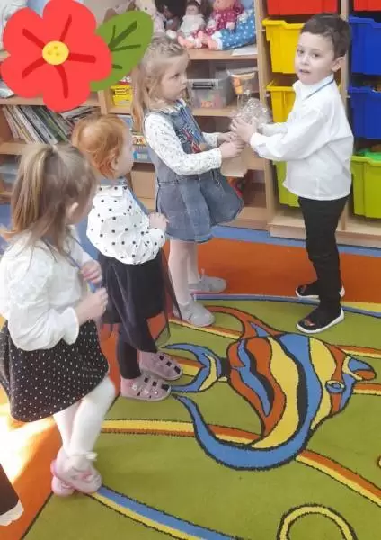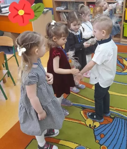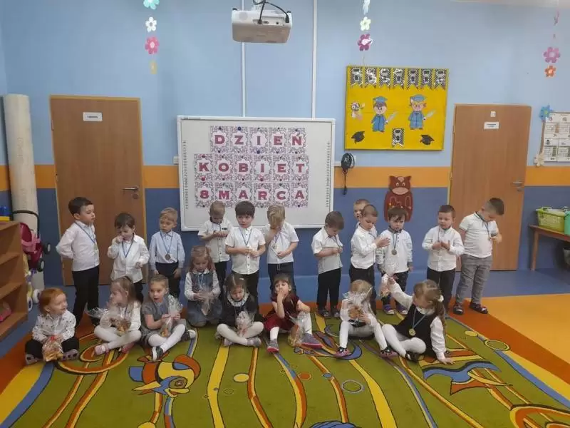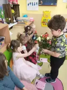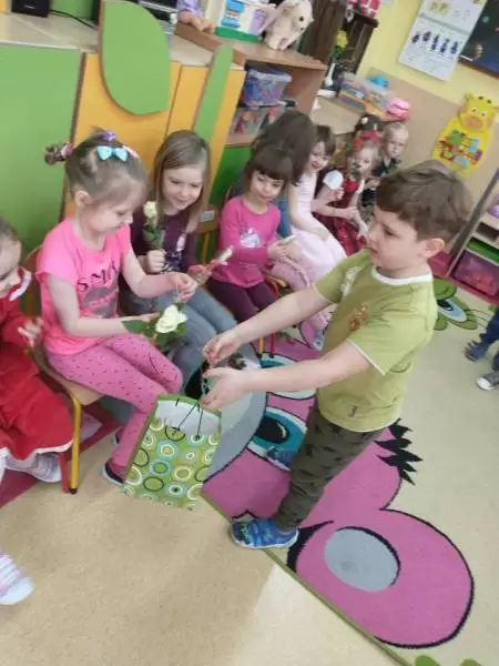 Chłopcy złożyli życzenia, tradycyjnie zaśpiewali swoim koleżankom uroczyste „100 lat”. Następnie wręczyli piękne laurki i niespodzianki. Chłopcy ze szczególnym zaangażowaniem starali się, aby ten dzień uczynić wyjątkowo miłym. Jako mali dżentelmeni wyręczali dziewczynki w codziennych obowiązkach między innymi w porządkowaniu sali po zabawie. Było można usłyszeć taneczną muzykę, w rytm której bawiły się zarówno dziewczynki jak i chłopcy. Wiele radości sprawiły dzieciom przygotowane z tej okazji zabawy i konkurencje. Uśmiechnięte buzie przedszkolaków, a zwłaszcza dziewczynek świadczyły o mile spędzonym czasie.