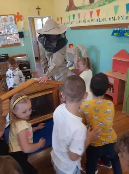 Odwiedzili nas wyjątkowi goście - Panie oraz pszczoły z pasieki Ziębów z naszej okolicy! Odbył się wspaniały pokaz i opowiadanie o pszczołach. Dzieci poznały najważniejsze informacje o tych niesamowitych owadach oraz oglądały je na żywo przez szybkę. Wspólnie poszukiwaliśmy odpowiedzi na interesujące nas pytania: -Kiedy pszczoły żądlą? Jak wygląda ul w środku? Co dzieje się z pszczołą kiedy użądli? Co pszczoły zbierają w kwiatach i w jakim celu? Jak wygląda plaster miodu?
