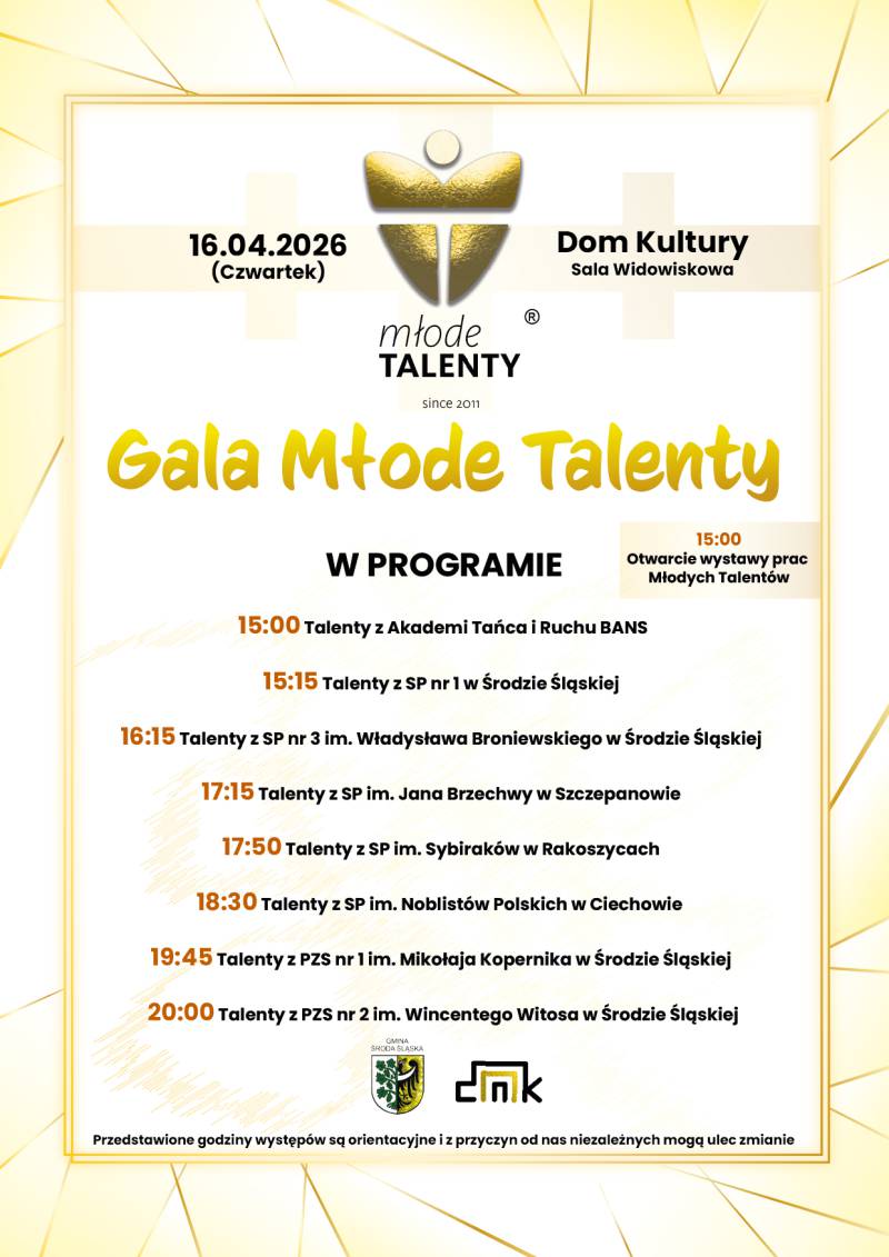 Gala Młode Talenty od lat gromadzi młodych artystów, tancerzy i wykonawców ze szkół podstawowych oraz ponadpodstawowych Środy Śląskiej i okolicznych miejscowości. W programie znalazły się zarówno występy sceniczne, jak i otwarcie wystawy prac plastycznych przygotowanych przez uczniów.