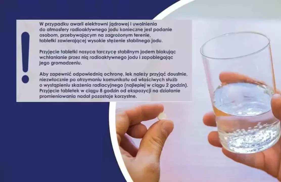 Obecnie nie ma ryzyka awarii elektrowni jądrowej, jednak działając profilaktycznie, na wypadek ewentualnego uwolnienia do atmosfery radioaktywnego jodu, konieczne będzie podanie osobom przebywającym na zagrożonym terenie tabletki zawierającej wysokie stężenie stabilnego jodu.