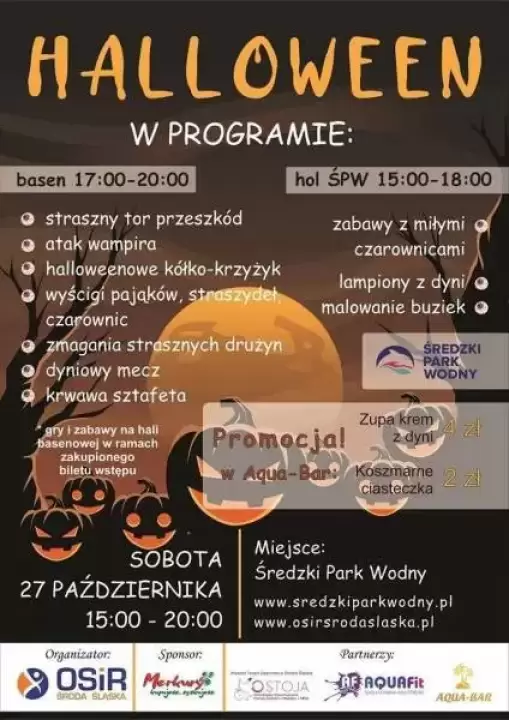 A o godzinie 17:00 na hali basenowej instruktorzy Aqua Fit zapewnią moc wrażeń. Straszny tor przeszkód, dyniowy mecz czy wyścigi pająków, to tylko niektóre z konkurencji. Na każdego uczestnika czekają słodkie upominki, a na zwycięzców nagrody.