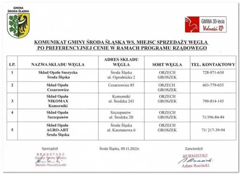 Informacja Gminy Środa Śląska ws. miejsc sprzedaży węgla po preferencyjnej cenie