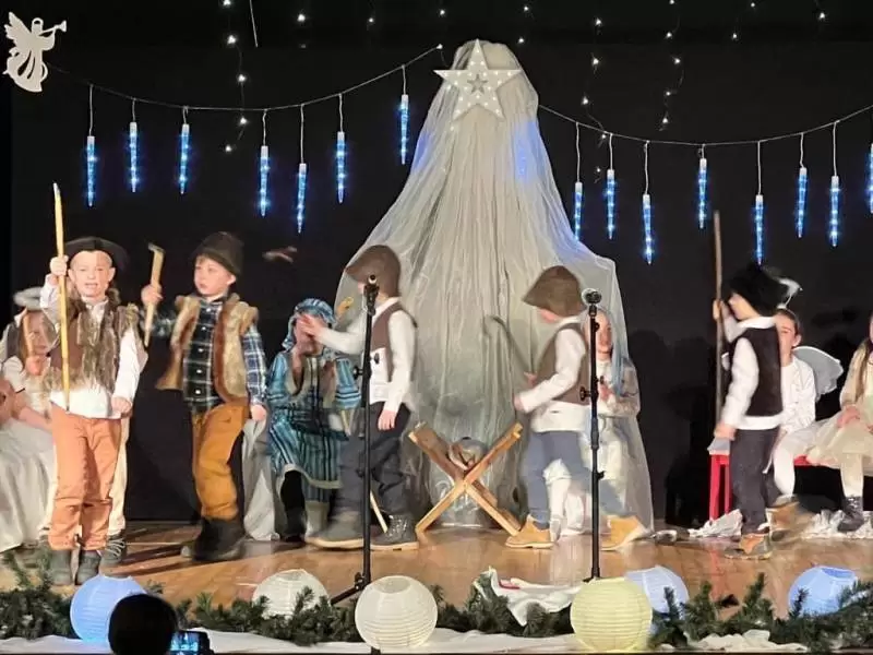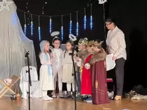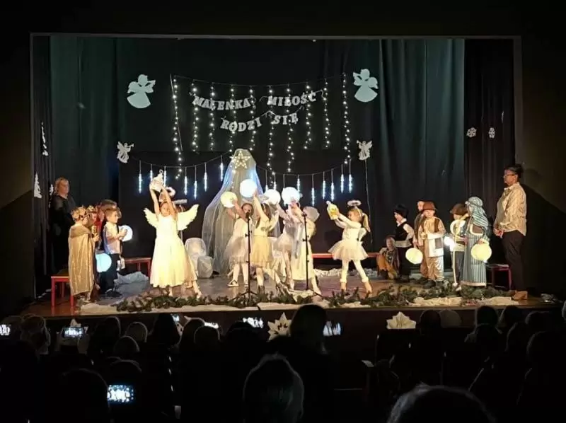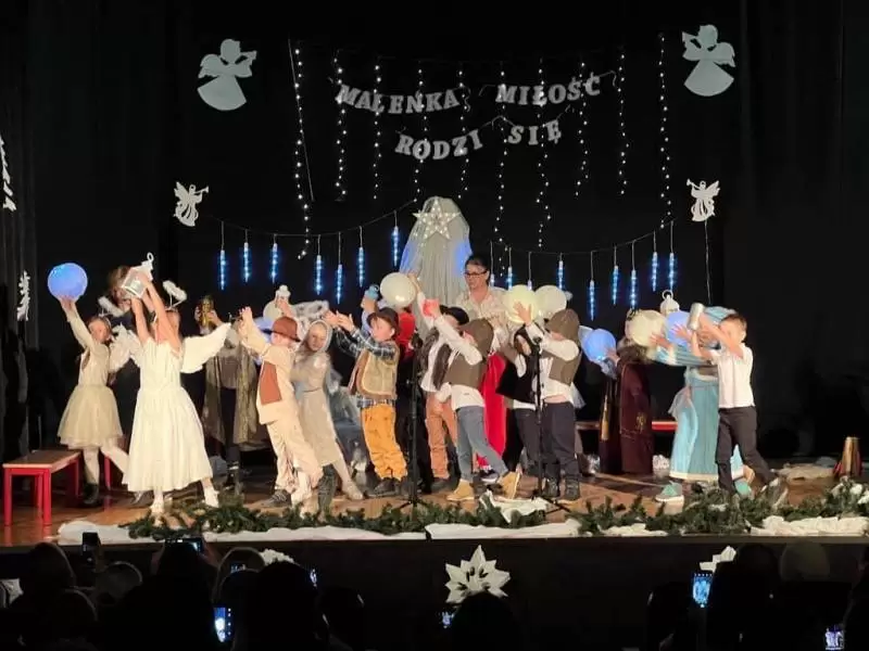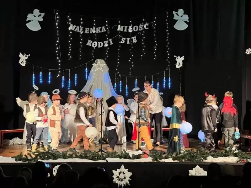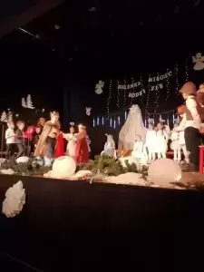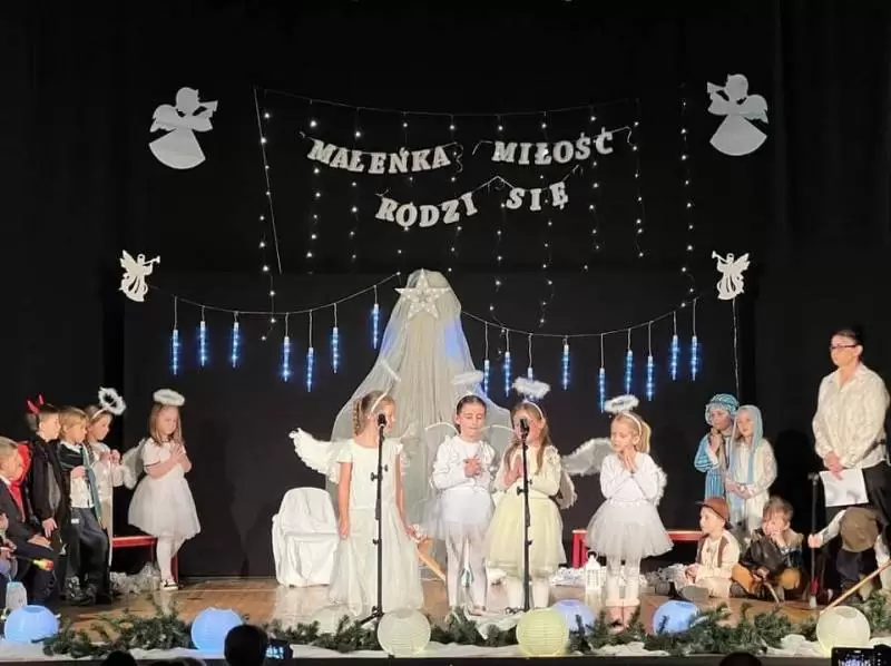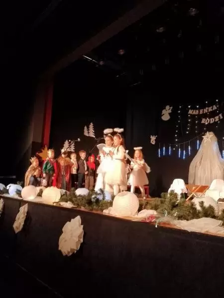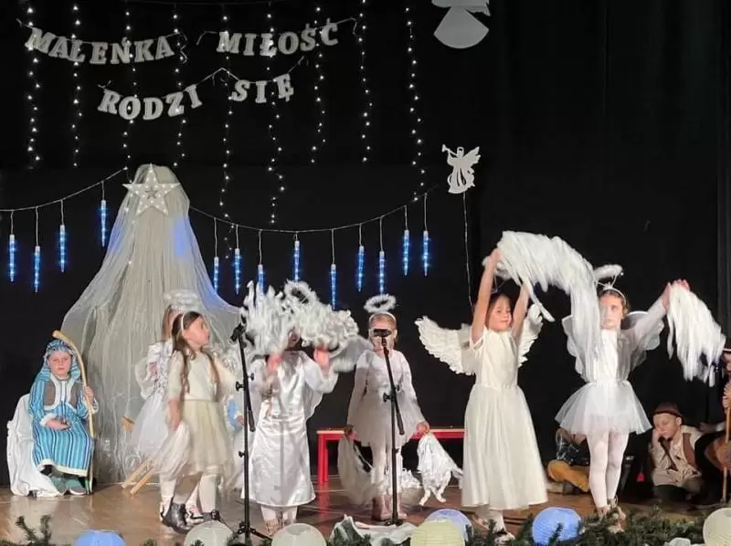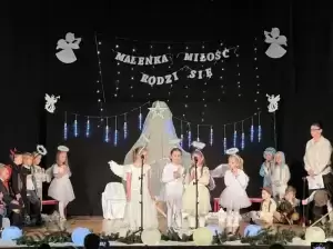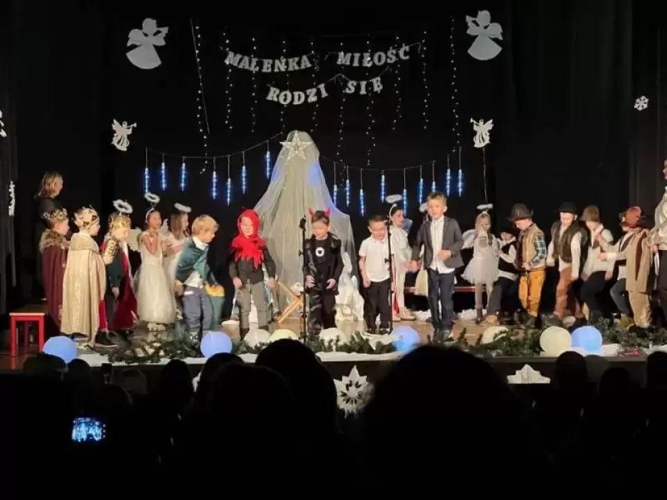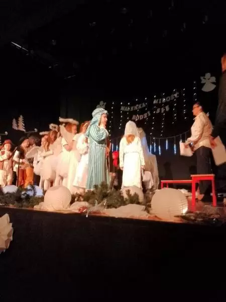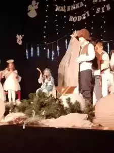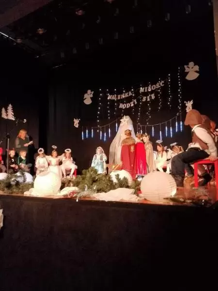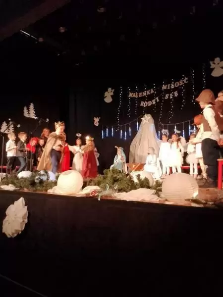Dzieci z grupy najstarszej ,,Jagódki” z Przedszkola Publicznego nr 3 w Środzie Śląskiej, na scenie Domu Kultury, w pięknych strojach przedstawiły historię narodzin Dzieciątka Jezus, oprawioną wzruszającymi kolędami, piosenkami oraz tańcami.