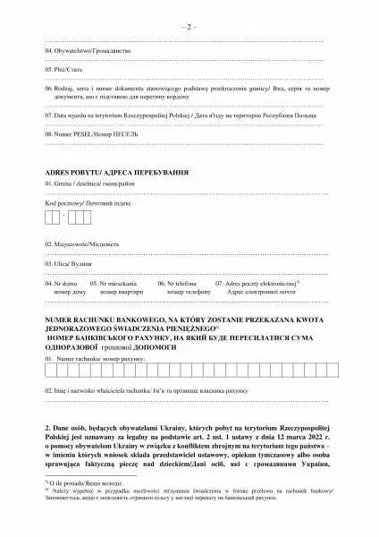 Громадянин України, перебування якого на території Республіки Польща вважається законним, тобто який законно в’їхав на територію Республіки Польща безпосередньо з території України в період з 24 лютого 2022 року, заявляє про намір залишитися. на території Республіки Польща та внесена до реєстру PESEL допомога у вигляді одноразової грошової допомоги у розмірі 300 злотих на особу на утримання, зокрема на покриття витрат на харчування, одяг, взуття, засоби особистої гігієни та плата за житло.