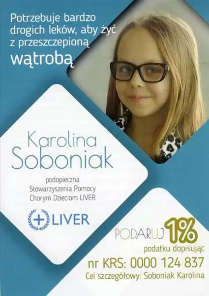 - Bardzo serdecznie dziękuję Szkole w Szczepanowie za zorganizowanie w grudniu kiermaszu świątecznego oraz wiosennej loterii losów. Chcę szczególnie podziękować wszystkim sponsorom za nagrody, jakie zostały przeznaczone do loterii. Serdeczne podziękowania należą się również właścicielowi sali zabaw „Kraina Bajek” w Środzie Śląskiej przy ul. Kolejowej, który postanowił nieodpłatnie zorganizować urodziny dla Karolinki. Piękne podziękowania kieruję także do Pani Asi oraz Michała, którzy mieszkają w Niemczech i pomagają w sprowadzeniu zagranicznego leku dla dzieci, podopiecznych fundacji LIVER. Największe jednak podziękowania należą się dawcy wątroby, to dzięki Niemu Karolinka może być dzisiaj z nami - podkreśla ze wzruszeniem p. Agnieszka. Do podziękowań dołącza się także Karolinka, a wszystkim chorym dzieciom życzy szybkiego powrotu do domu i jak najmniej pobytów w szpitalach.