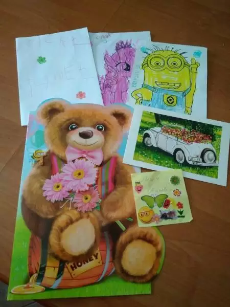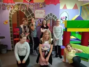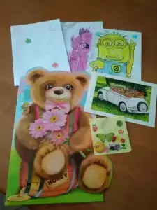 fot.: urodziny na sali zabaw w Środzie Śl., Karolina z kuzynem Dawidem, który odwiedził ją 4 tyg. po przeszczepie wątroby w Centrum Zdrowia Dziecka w Warszawie, kiermasz charytatywny w Szkole w Szczepanowie (grudzień 2017), kartki i laurki, które Karolinka otrzymała po powrocie ze szpitala, Karolinka (październik 2018).