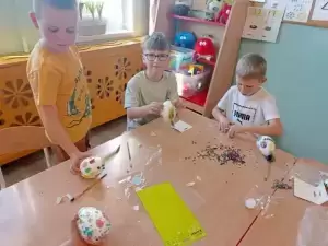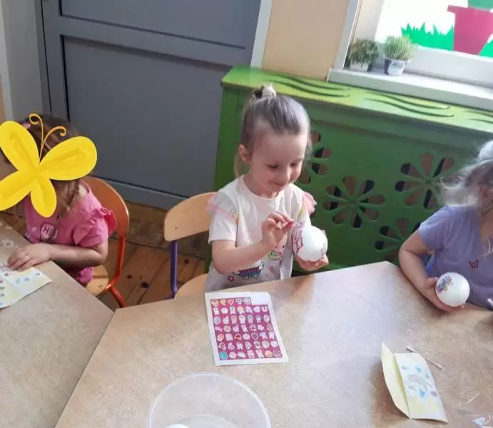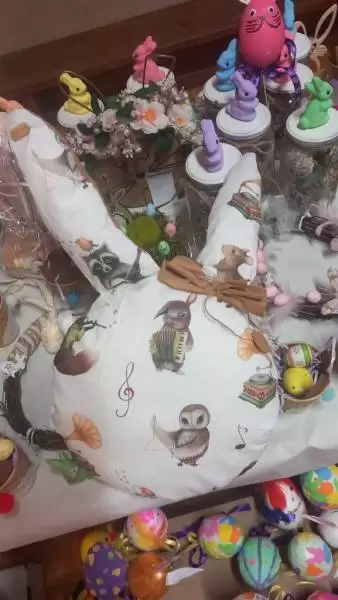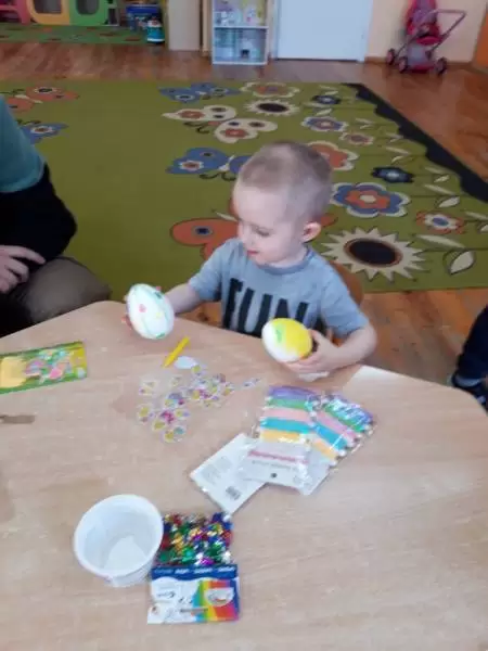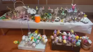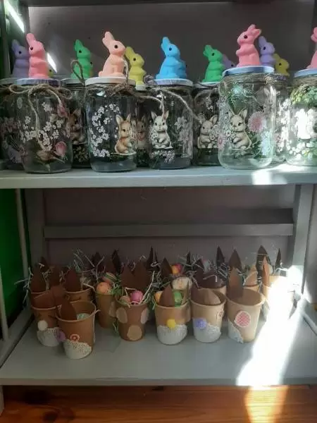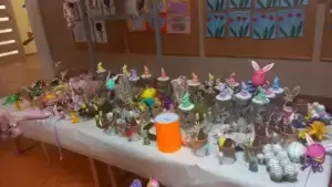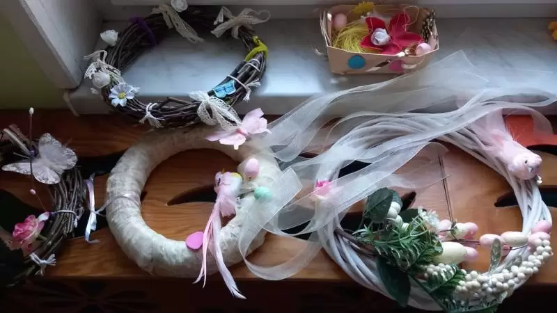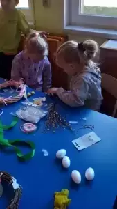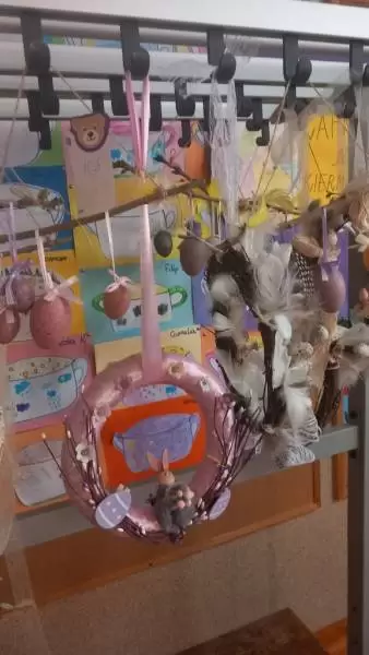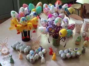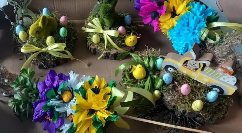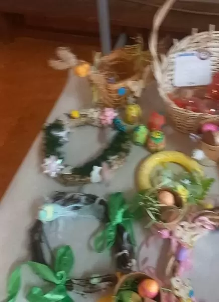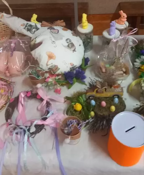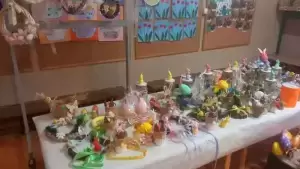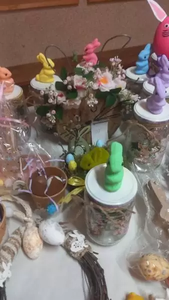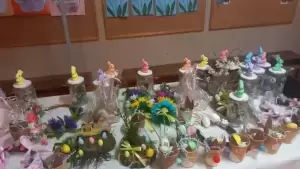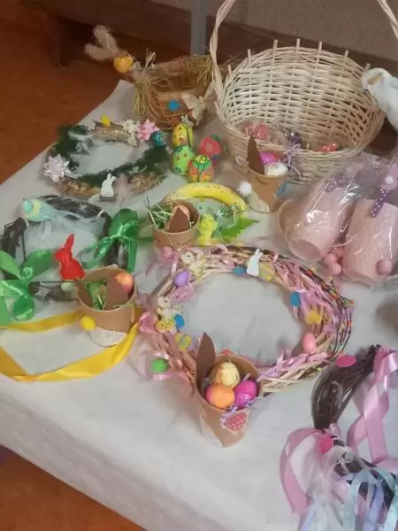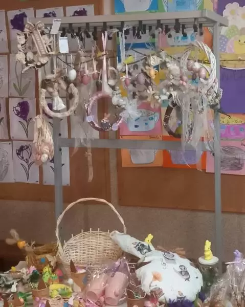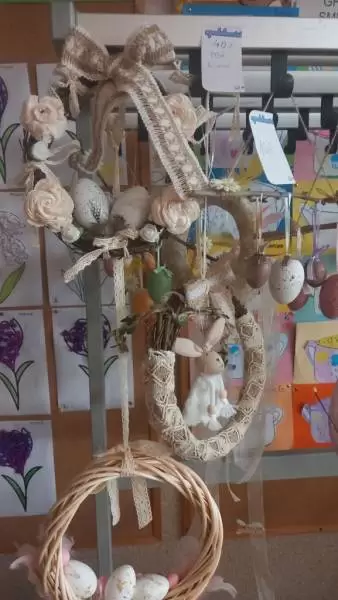 Wśród kolorowych dekoracji, którymi autorami byli wszyscy – Dzieci, Rodzice, Nauczyciele, można było kupić wiosenno-wielkanocne wianki, stroiki, kolorowe pisanki, ręcznie robione mydełka, figurki gipsowe, wiszące dekoracje z pisanek, ozdobne słoiki z zajączkiem oraz wiele innych świątecznych drobiazgów.