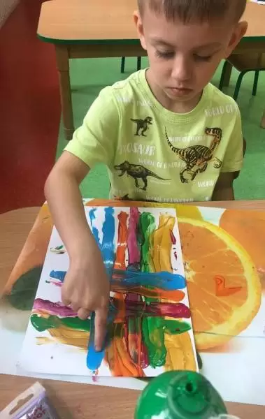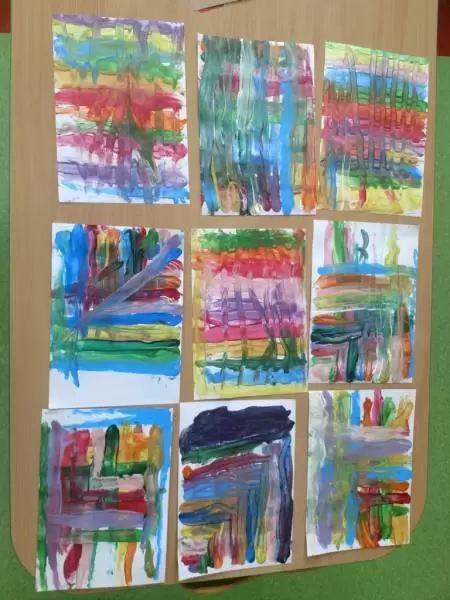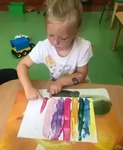 W poniedziałek obowiązywały kolory tęczy, w tym dniu przedszkolaki zapoznały się ze zjawiskiem poznawania tęczy oraz w czarodziejski sposób stworzył obraz i obserwowały w jaki sposób kolory wpływają na siebie.