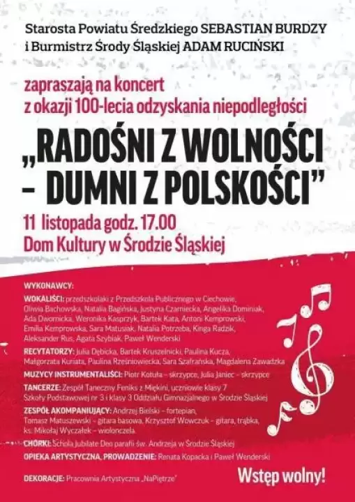 Jutro (11.11.2018 r.) o godzinie 17:00 w Domu Kultury w Środzie Śląskiej odbędzie się koncert z okazji 100-lecia Niepodległości Polski.