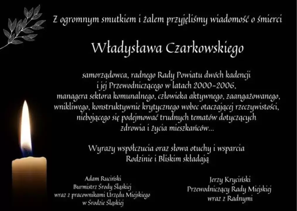 Wyrazy współczucia oraz słowa otuchy i wsparcia Rodzinie i Bliskim Władysława Czarkowskiego składają - Burmistrz Środy Śląskiej wraz z pracownikami Urzędu Miejskiego oraz Przewodniczący Rady Miejskiej w Środzie Śląskiej wraz z Radnymi.