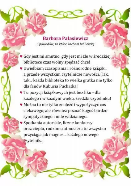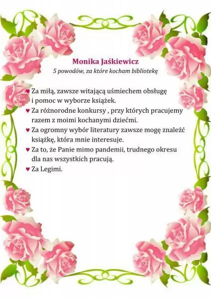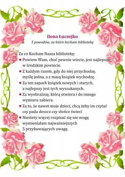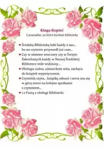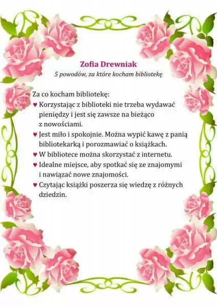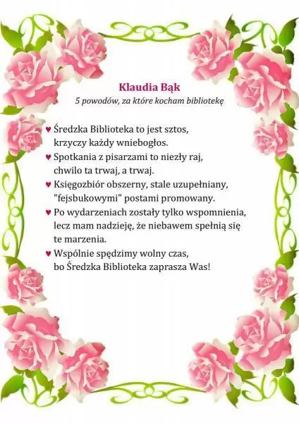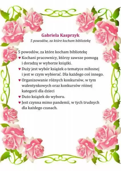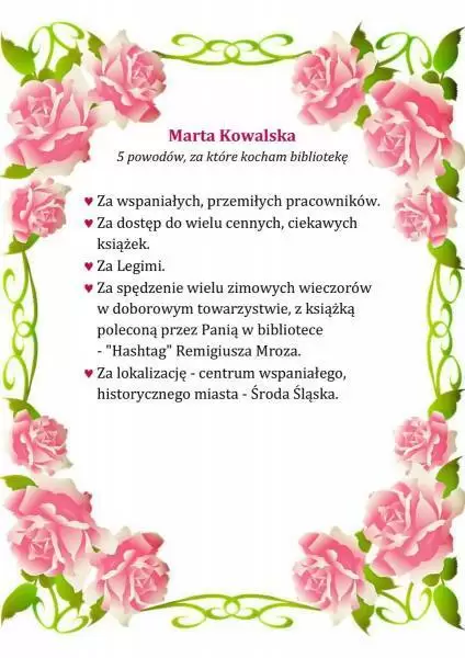 Pracownicy Biblioteki Publicznej w Środzie Śląskiej w przekonaniu, że miłością można darzyć również książki i bibliotekę, dlatego z okazji walentynek przygotowali konkurs literacki pt. „5 powodów, za które kocham bibliotekę”.