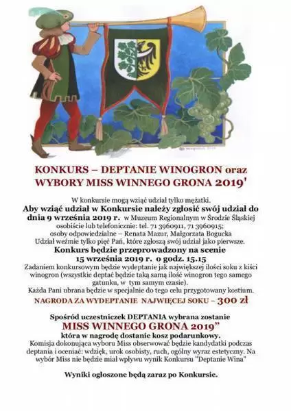 Konkurs będzie przeprowadzony na scenie 15 września 2019 r. o godzinie 15:15. Zadaniem konkursowym będzie wydeptanie jak największej ilości winogron tego samego gatunku, w tym samym czasie. Każda Pani ubrana będzie w specjalnie do tego celu przygotowany kostium.