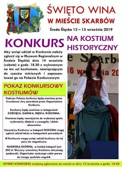 Aby wziąć udział w Konkursie należy zgłosić się w Muzeum Regionalnym w Środzie Śląskiej w dniu 14 września (sobota) o godzinie 18:30 z wykonanym kostiumem, nawiązującym do czasów minionych i zaprezentować go na Pokazie Konkursowym.