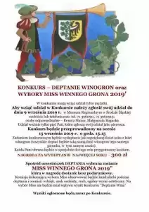 Spośród uczestniczek DEPTANIA wybrana zostanie MISS WINNEGO GRONA 2019, która w nagrodę dostanie kosz podarunkowy. Komisja dokonując wyboru Miss obserwować będzie kandydatki podczas deptania i oceniać: wdzięk, urok osobisty, ruchy, ogólny wyraz estetyczny. Na wybór Miss nie będzie miał wpływu konkurs „Deptanie Winogron”.