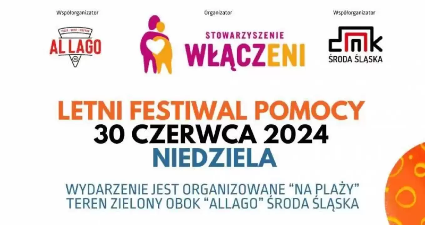Dom Kultury w Środzie Śląskiej i Stowarzyszenie Włączeni, zapraszają na Letni Festiwal Pomocy, który odbędzie się w najbliższą niedzielę na plaży przy Al Lago Pizza Wino Muzyka (ul. Górna 3).