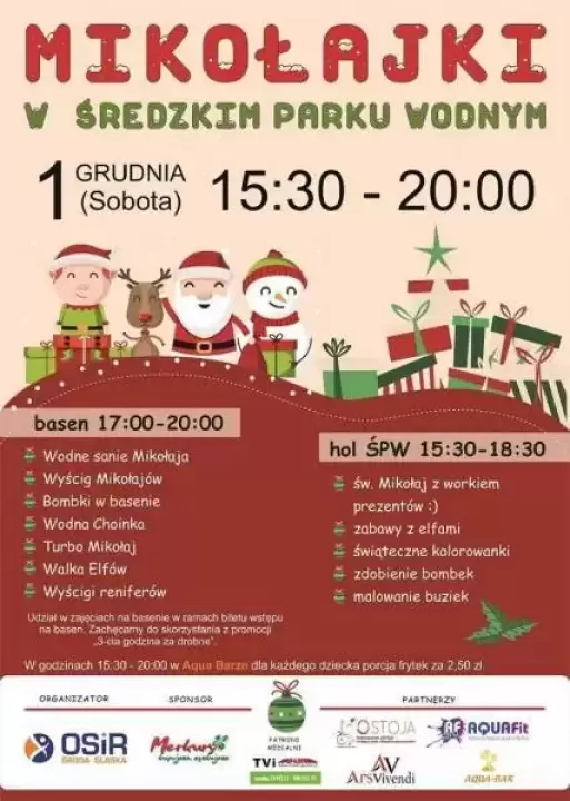 - W sobotę (1 grudnia) zapraszamy wszystkich małych i dużych na spotkanie ze Świętym Mikołajem i jego pomocnikami, którzy będą na Was czekać w holu głównym od godziny 15:30 - zapraszają pracownicy Średzkiego Parku Wodnego.