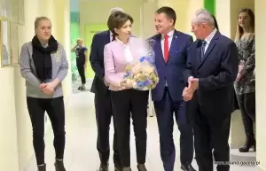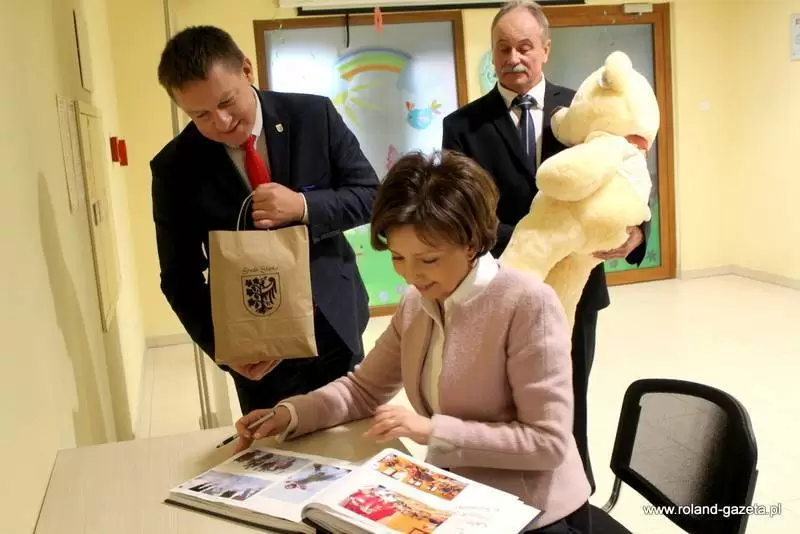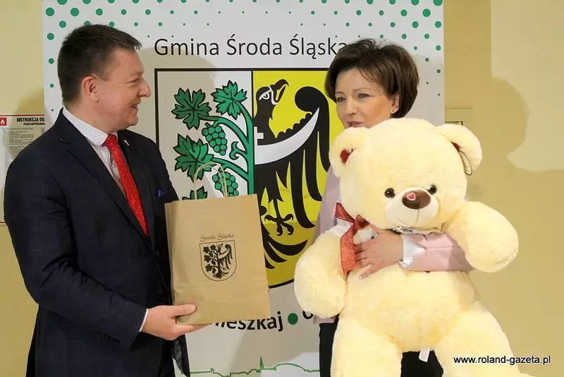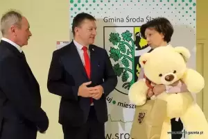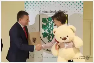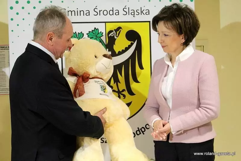 Pani minister odwiedzając grupę Żabek obdarowała pociechy pluszakami. W podziękowaniu za złożenie wizyty w średzkiej placówce minister Marlena Maląg otrzymała z rąk dyrektora placówki wielkiego misia.