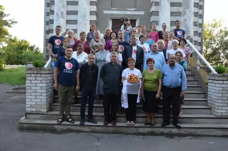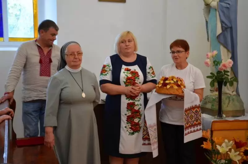 Pod koniec Mszy, bardzo miłym gestem ze strony tamtejszej Polonii było podziękowanie dla wolontariuszy i pożegnanie nas pięknie udekorowanym chlebem z pobliskiego Berdyczowa, a także wręczenie nam kubeczków z wizerunkiem kościoła w Samgorodku oraz folderów związanych z tamtejszym regionem.