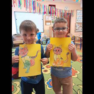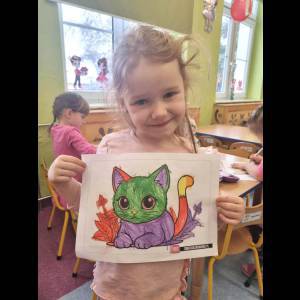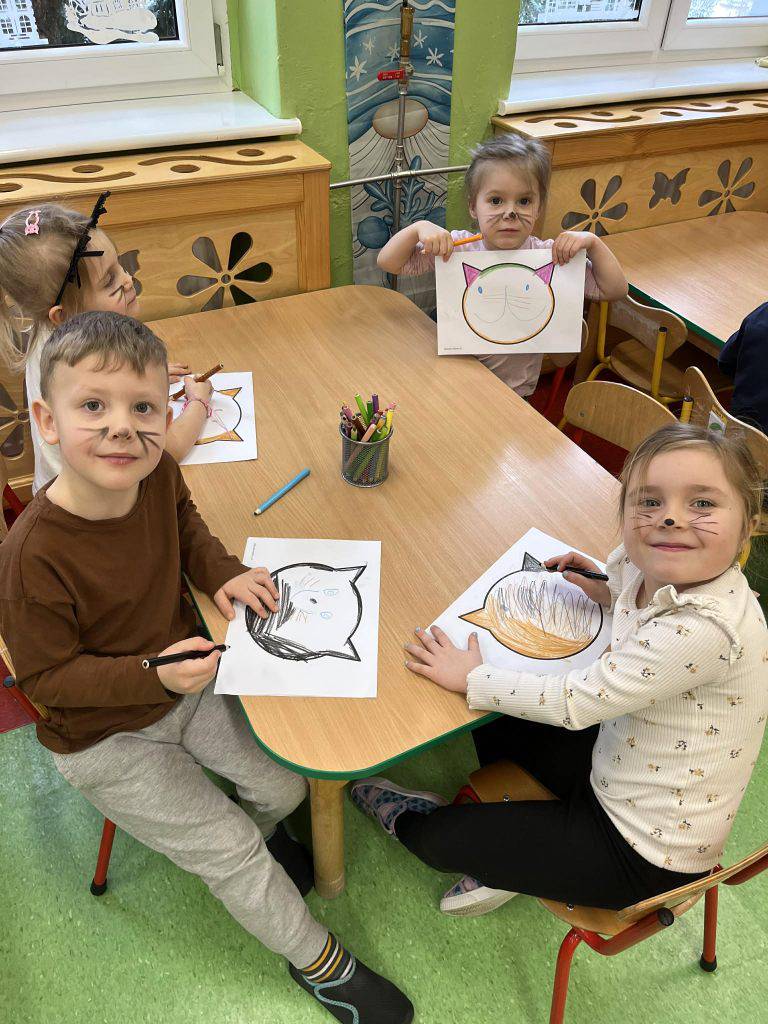 W programie dnia znalazły się również zabawy ruchowe inspirowane kocimi zwyczajami – dzieci skradały się jak koty, przeciągały niczym po długiej drzemce i ćwiczyły zwinność podczas toru przeszkód „Kocia ścieżka”. Ogromnym zainteresowaniem cieszyły się warsztaty plastyczne, podczas których powstały przepiękne portrety kotów wykonane różnymi technikami.