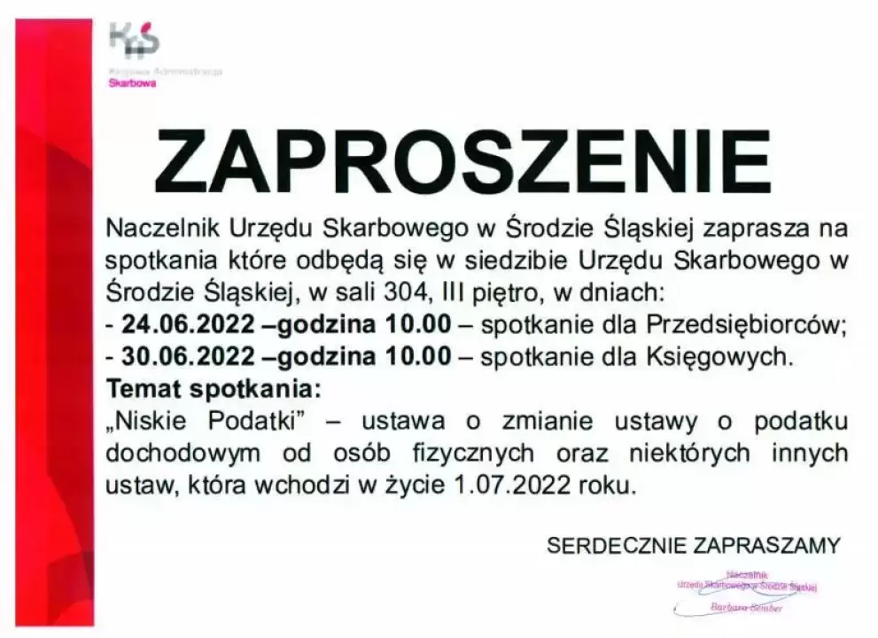 Naczelnik Urzędu Skarbowego w Środzie Śląskiej zaprasza na spotkanie pt. "Niskie Podatki"