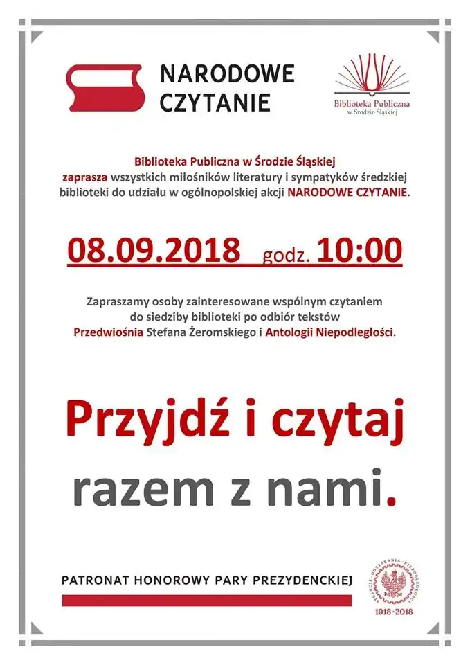 Ogólnopolska akcja "Narodowe Czytanie" cieszy się ogromną popularnością, więc zapewne i w tegorocznej edycji znajdą się chętni do wspólnego czytania w Bibliotece Publicznej w Środzie Śląskiej.