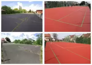 Położeniem nowej nawierzchni boiska zajmowała się firma JUL-DOM ze Szczecina. Boisko asfaltowe o pow. 530 m2 pokryte zostało nową nawierzchnią poliuretanową, odporną na warunki atmosferyczne i bardzo wytrzymałą. – Boisko sprawia bardzo dobre wrażenie, a nawierzchnia jest wysokiej jakości – ocenia Maciej Kogutek, prezes i trener KS „Skarby” Środa Śląska, członek komisji odbiorowej. - Ma nietypowe wymiary, ale myślę, że sprawdzi się np. przy dziecięcej piłce rugby. Wymiary są też odpowiednie do gry w siatkówkę, a po zamontowaniu bramek na pewno znajdą się chętni na podwórkową piłkę nożną – dodaje Maciej Kogutek.