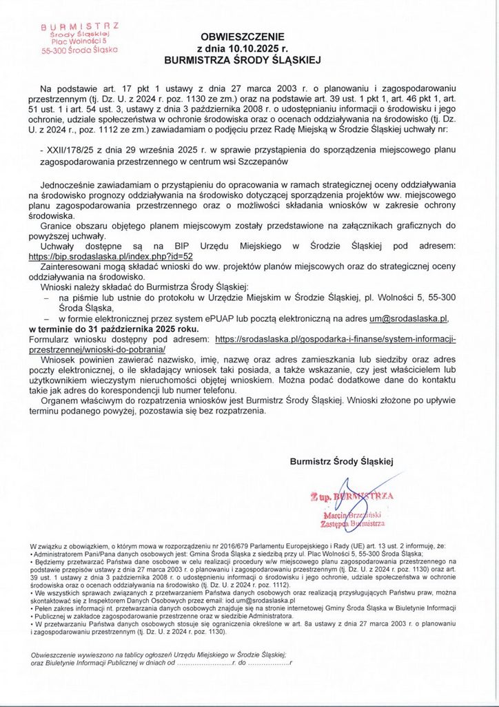 Jednocześnie zawiadamiam o przystąpieniu do opracowania w ramach strategicznej oceny oddziaływania na środowisko prognozy oddziaływania na środowisko dotyczącej sporządzenia projektów ww. miejscowego planu zagospodarowania przestrzennego oraz o możliwości składania wniosków w zakresie ochrony środowiska.