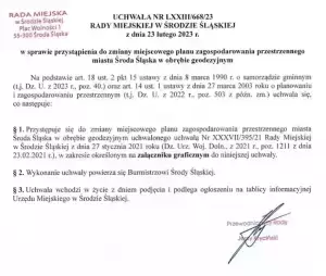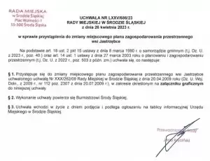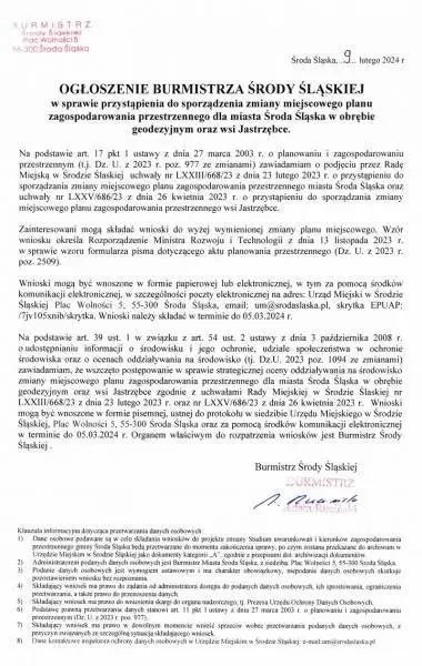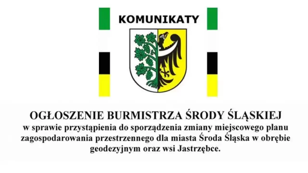 Ogłoszenie Burmistrza Środy Śląskiej w sprawie przystąpienia do sporządzenia zmiany miejscowego planu zagospodarowania przestrzennego dla miasta Środa Śląska w obrębie geodezyjnym oraz wsi Jastrzębce.