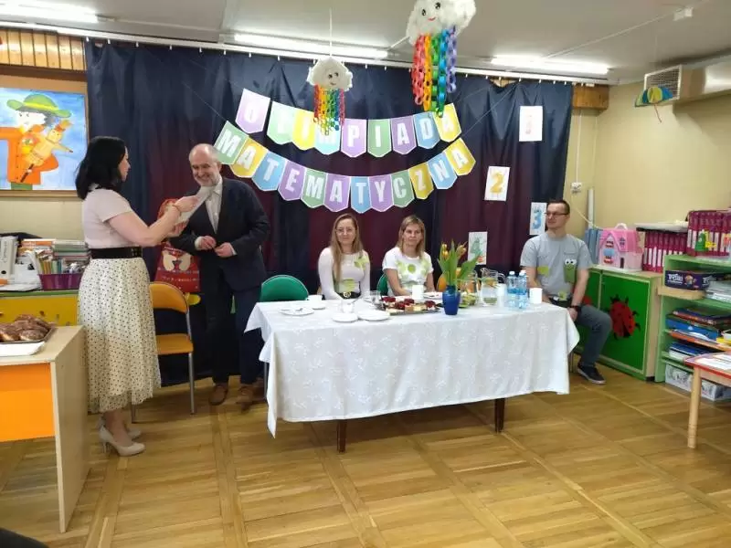 Naszych gości powitały dzieci z grupy "Zuchów" śpiewając i tańcząc do piosenki matematycznej. Każdy trzyosobowy zespół miał do rozwiązania 8 zadań matematycznych, przygotowanych przez Panią Arletę Rajczakowską - pomysłodawcę olimpiady. Były to zadania takie, jak: przeliczanie, porównywanie liczb, rytmy, kodowanie, pamięć wzrokowa, koordynacja itd.