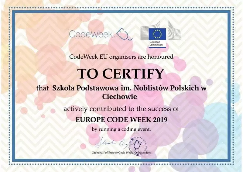Szkoła w Ciechowie jako pierwsza w powiecie wprowadza nowoczesne rozwiązanie, jakim jest legitymacja w smartfonie ucznia. W ramach deklarowanego udziału w tygodniu kodowania uczniowie koła matematycznego wraz z opiekunem przeprowadzili również działania wraz z akcją „CodeWeek2019 ” w terminie 7 – 11 października. CodeWeek to organizowana na terenie całej Europy, społeczna inicjatywa, dedykowana wszystkim, którzy chcą rozpocząć lub kontynuować przygodę z programowaniem. Stało się to świetną okazją, by zacząć zabawę z grami logicznymi i kodowaniem.