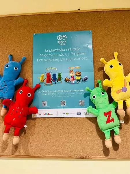 Nasze dzieci uczestniczą również w Międzynarodowym Programie Powszechnej Dwujęzyczności „Dwujęzyczność Dzieci/ Bilingual Future” dzięki któremu każdego dnia wraz z maskotkami Beetles bawią się, słuchają i śpiewają piosenki w języku angielskim.