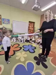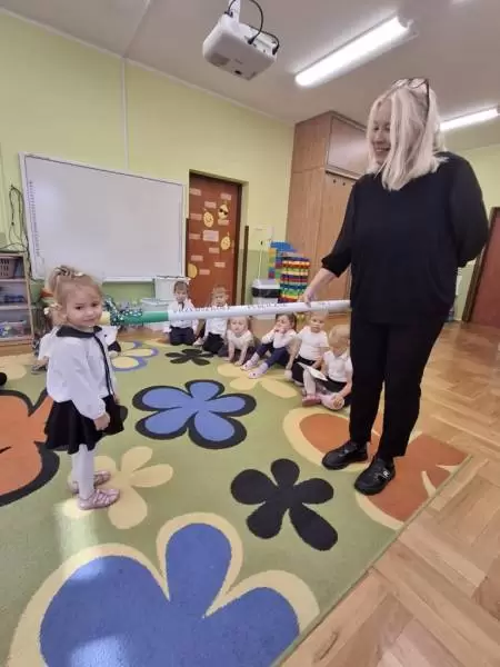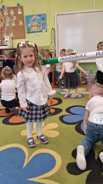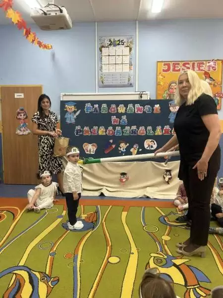 Uroczystość rozpoczęła się od wesołych występów artystycznych. Dzieci śpiewały piosenki, recytowały wierszyki i tańczyły. Najważniejszym punktem programu było oczywiście pasowanie. Pani Dyrektor dużą, kolorową kredką dotykała ramienia każdego dziecka, ogłaszając je pełnoprawnym przedszkolakiem. To symboliczny, ale niezwykle radosny moment, który na długo pozostanie w pamięci najmłodszych.