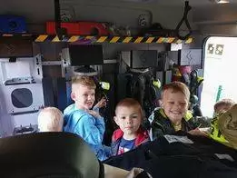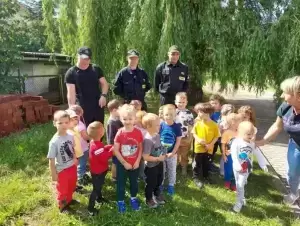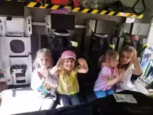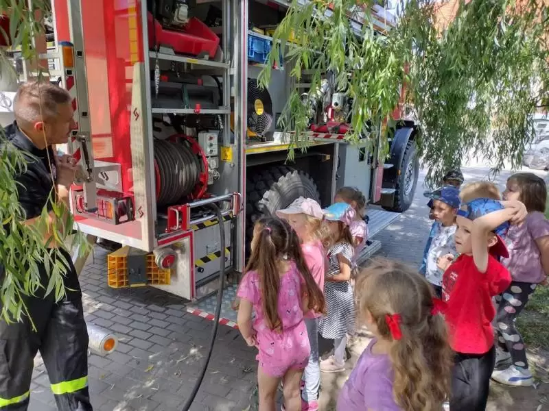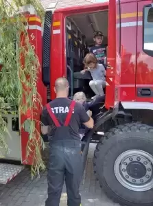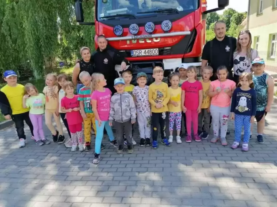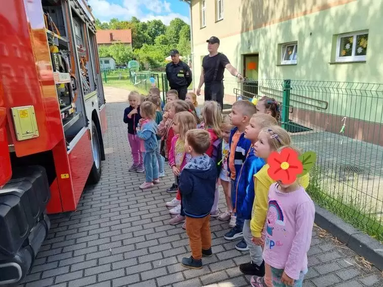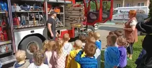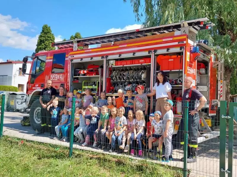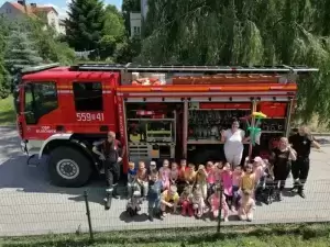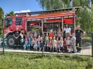 Strażacy pokazali dzieciom sprzęt i wyposażenie spechalistycznego wozu. Dzieci miały możliwość z bliska podziwiać oprzyrządowanie jakim dysponują strażacy podczas swojej ciężkiej i odpowiedzialnej pracy. Przedszkolaki mogły wejść do wozu i przez chwilę poczuć się jak strażacy podczas akcji przeciwpożarowej. Wszyscy byli pod dużym wrażeniem tej chwili. Z pewnością wielu chłopców marzy, by w przyszłości zostać strażakiem. Spotkanie zakończyło się pamiątkowym zdjęciem i wręczeniem podziękowań.
